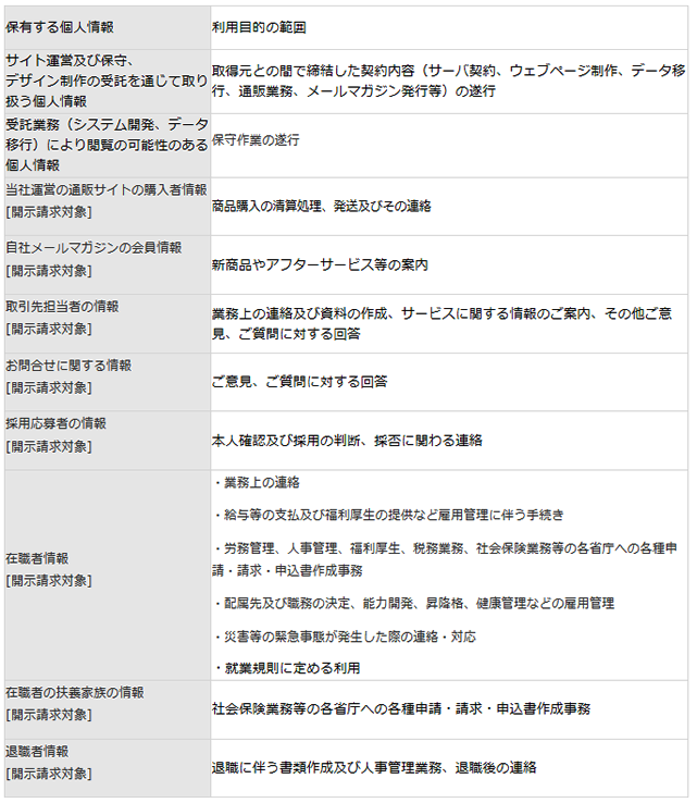 本人もしくは取引先等を通じて当社が取得する個人情報の利用目的は下表になります。利用目的の通知を希望の方は下記表をはじめに確認してください。また「開示請求対象」と付記された個人情報は、当社において本人への開示等(利用目的の通知、個人情報の開示と、開示の結果に対する内容の訂正、追加または削除、利用停止、消去及び第三者への提供の停止)が可能な個人情報となります。自己の個人情報について、開示等を希望される場合は、表以降のご請求手続きを確認の上、お問い合わせください。