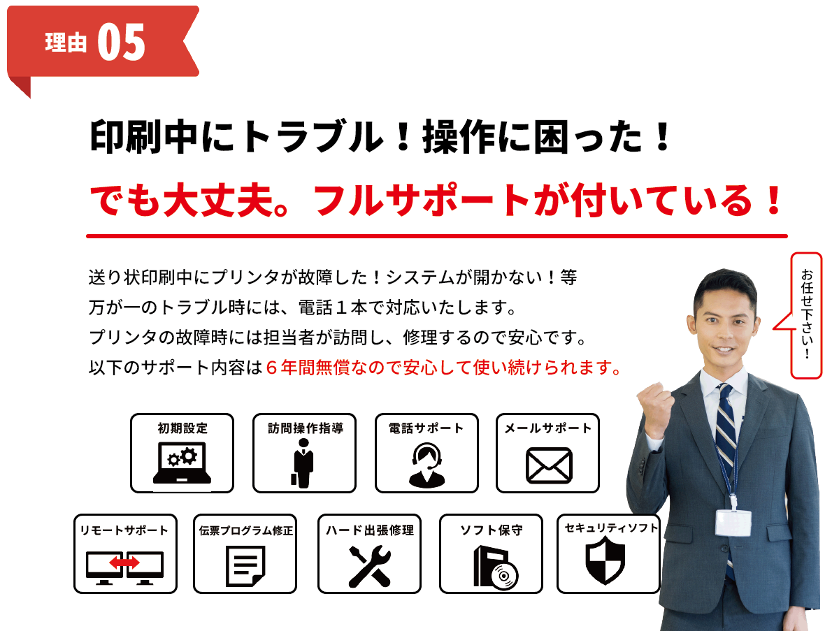 システム使用中に操作不明点やパソコンやプリンタ故障が起きても、大丈夫です。即日対応で、追加料金が発生することはございません。出張修理も0円で安心です!