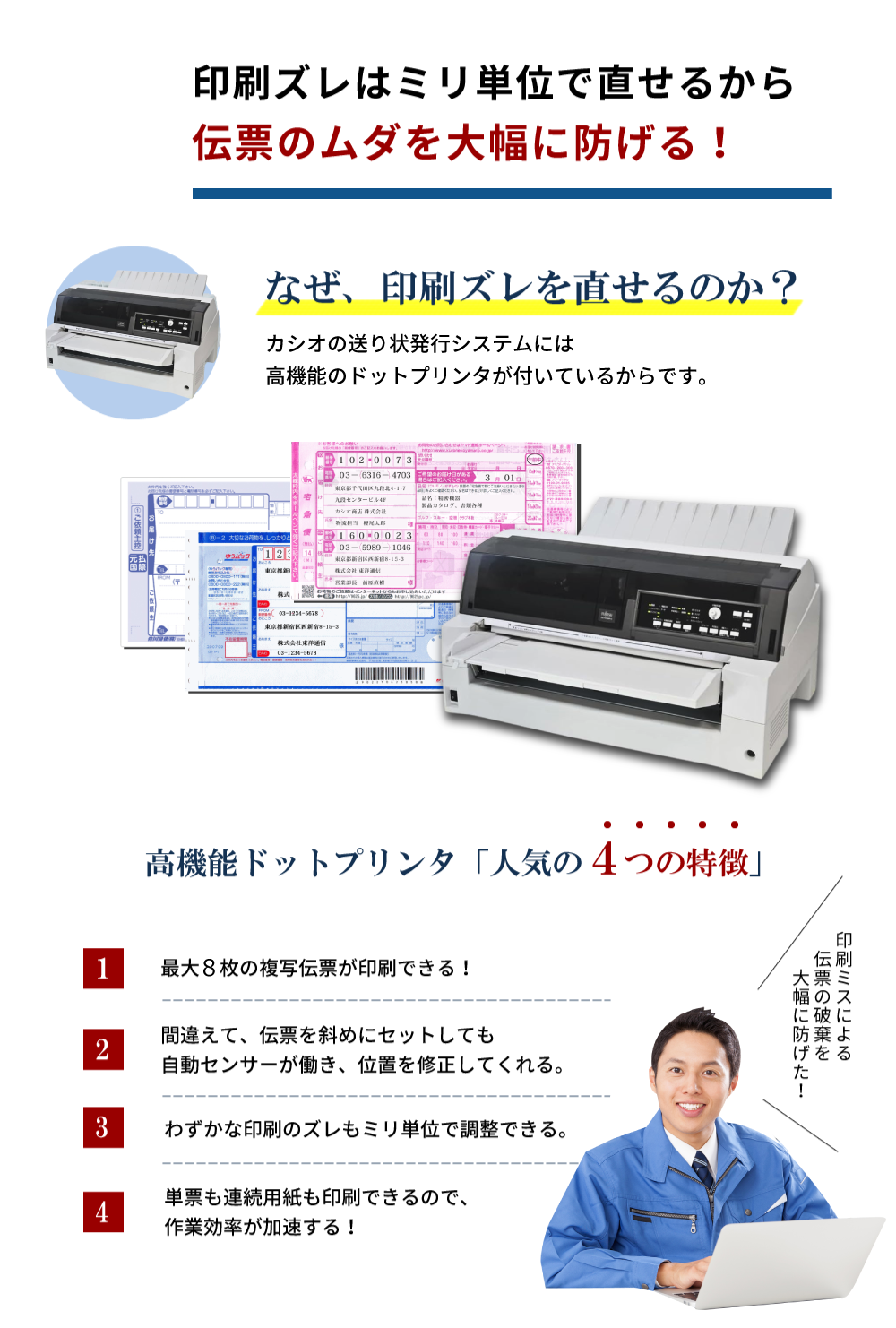 単票用紙も連続用紙も自動で切り替わり印刷できるので、送り状などを大量に印刷したり、急に1枚だけ送り状印刷したい時でも時間をかけずに切り替えることが可能。